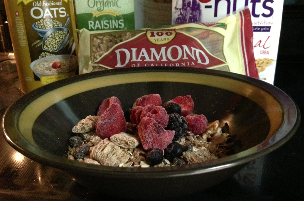 The basic recipe calls for: old fashioned oats, Grape Nuts, bite sized shredded wheat and “Uncle Sam cereal”.  For the life of me I couldn’t find “Uncle Sam cereal” so I substituted that with a  Ezekial 4:9 Sprouted Whole Grain Cereal.  To that you add flaxseed meal, raisins and walnuts; which I dutifully did.  Next you are supposed to add a banana and kiwi.  I’m not a huge fan of banana so I decided to have that on the side, or as a light snack shortly after breakfast.  The kiwi I replaced with frozen mixed berries (blackberries, raspberries, blueberries and strawberries).