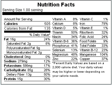 Nutrition wise this is a solid meal as well, as you’d expect with a meal made of fortified cereals, fresh fruits, nuts and seeds.  Below you can see the nutritional information for the dry ingredients alone.  It’s a bit high on the calories for what I’m used to, at 505, but it has tons of fiber, half a day’s worth, a good amount of protein and a nicely rounded multi-vitamin mix.  Once you add the berries, soy milk and banana the whole meal comes to a good 700+ calories with an even better nutrient profile.  If you are only eating three times a day with light snacking in between that is exactly what you want.
