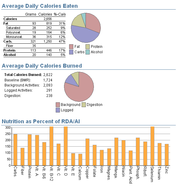 Looking at these monthly charts I can get an idea of how things went in terms of nutrition and calorie balances. Based on the fact I began the month at about 180-181 pounds and ended the month in that same range, means that I should have about a net calorie balance between my output and my input. As can be seen in the graphs, that’s exactly what I have. Give or take on the average day I ate 30 calories more than I brought in. Looking at the time history of the month that looked like most days were slightly under in calories with a few days way way over in calories. That’s how I plan things mostly. I love eating and drinking richly with friends and family, which is mostly on the weekends. If I don’t want to get heavier over time I need to build up calorie deficits over longer times. However if I stay at too low a calorie level for too long then that could cause my body to go into starvation mode, which will just cause my metabolism to slow and start a bad downward cycle. That’s not a good thing at all.