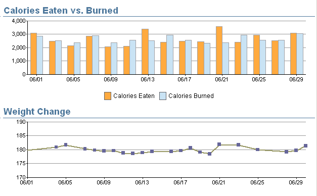 With July underway I wanted to belatedly post what the first of many monthly updates. During the actual experiment phase these sorts of updates will allow me to look at large scale changes during a diet phase. By looking at the month as a whole it is possible to see much longer term trends than what one can see for simple daily or weekly stats, which will also be a bigger part of the experiment. You can see graphs of the various elements and their discussions below the fold: