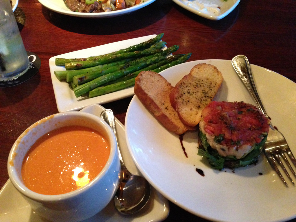 As much as I would have liked to have had wine or beer with everyone else, the version of veganism I’m doing only allows alcohol once or twice a week. Over a one week period I’m setting that to zero. So, no alcohol and no Coke Zero. My friend ordered these deep fried asparagus spears with some sort of creamy dipping sauce. They looked and smelled delicious, especially piled up like a fort with a pool in the middle of it. Unfortunately I’m sure there is egg in that recipe since that’s probably what’s used to keep the breading on, so I had to abstain. While everyone else got some sort of red meat item akin to what I would usually buy, I ordered the veganized White Bean Salad, veganized Tomato Soup and sauteed asparagus. I was surprised at the shear volume of food I got: