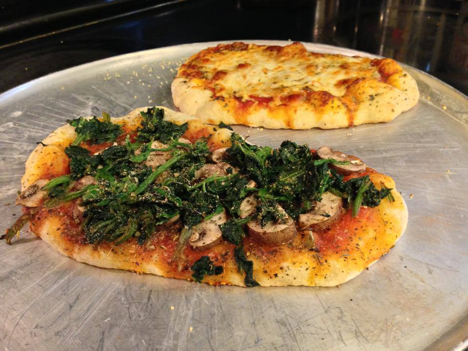 By the time I got done my run it would be too late to do something too exotic, plus I had some pizza dough from last week that I had to use up.  Rather than do the usual one big pizza I made a vegan pizza for myself and a regular one for my partner.  Rather than cheese I loaded it up with baby portobello mushrooms and cooked spinach.  I was hoping to get time to saute both of them, but no dice.  A little extra seasoning on top made up the difference though.  I arranged the mushrooms on top of the seasoned sauce first and then put some spinach on top of that.  I didn’t chop up the spinach because I wanted some of that “stringy cheese” feel to the pizza.  The spinach acts exactly like that.  With the huge piles of vegetables on top I can honestly say I didn’t miss the cheese much at all.
