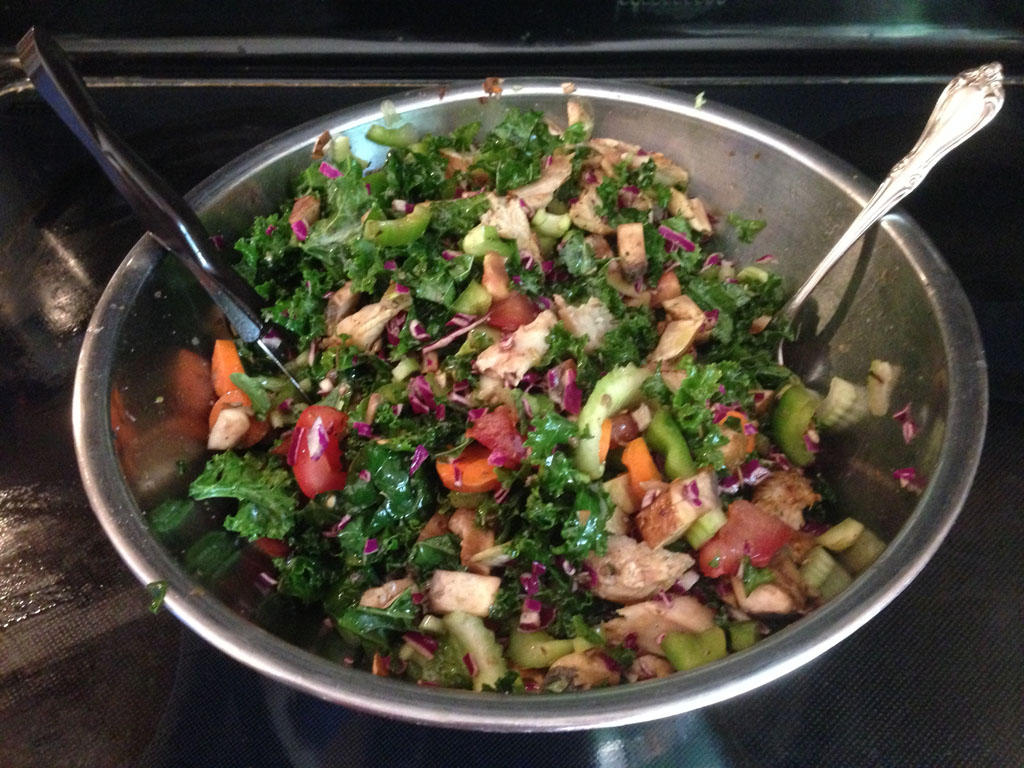 I have my common base of some sort of leafy greens usually. Depending on what is available or what I have that could be anything from a red leaf lettuce to turnip or dandelion greens. Tomatoes, if they are available in any form with quality, will be another relative constant, as will carrots. The rest will change from day to day. This particular salad has kale, celery, carrots, tomatoes, shredded purple cabbage, green peppers and raw portobello mushrooms. This particular time I also added some chicken. I used to always put chicken or fish, usually salmon, in my salads but in the past few months that is not what I have been craving. I’ve been craving salads without the meat, so these often are vegan salads. I get plenty of meat in other meals, so I can usually skip it for a meal with this much volume of fruits and vegetables.