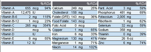 As you can see, in many of the micro nutrients you come close to if not exceeding at least half of your recommended daily allowance. Some, like Vitamin A, B-6 and Niacin you are meeting or exceeding these values. This is all for one enormous meal. Two of these in a day and you are meeting or exceeding your micronutrient requirements as well as the recommendations for vegetable consumption.