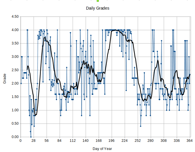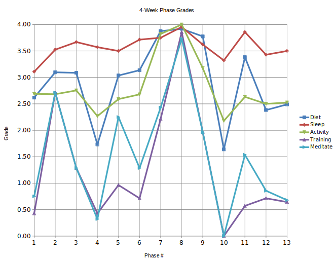 What we have is the grade for each of the categories for each of the 4-week periods that make up a whole year (a total of 13). After my personal come to Jesus moment in June I actually made good progress dialing things in for part of the 7th, all of the 8th, and part of the 9th phases. For the most part however things were a hot mess with respect to these goals. Yes, there were life events that drove a bunch of these things but a lot of that is just excuses. If I can find time to take in a few episodes of Veep I can find time to do 15 minutes of meditation, 5 minutes of calisthenics, and getting a little more activity in a day. I chose not to. I am pretty consistent with sleep, but in the particularly busy phases even that started slipping. If we look at it from the perspective of the daily grades in aggregate you see similar trends: