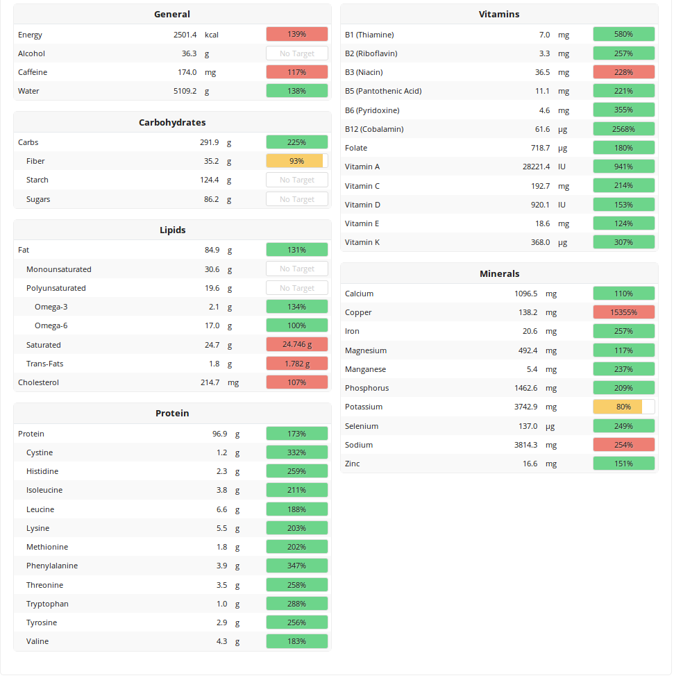 - The fiber levels being less than the RDA is completely off for my preferred healthy diet lifestyle. When I’m eating like that I’m easily getting on the order of twice that much fiber.