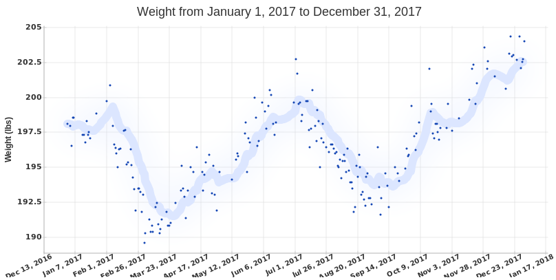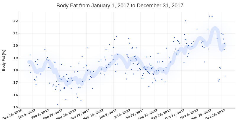 So 2017 wasn’t the most dialed in year I’ve ever had. It was honestly quite average, again by American standards. Yet we see where that trend ends, right? “Just” picking up a few pounds a year moving forward will lead me to an equilibrium weight somewhere in the 220-230 pound range, and probably a good helping of hypertension, pre-diabetes, and coronary artery disease to go along with it. Those lead to other chronic conditions which lead to reduced longevity and exponentially growing health problems later in life. Just like this point last year I have all the instrumentation in place to measure these things. Just like last year I obviously don’t have a problem actually taking my measurements in these areas. Where I’m falling down is in the execution of using these metrics as a mechanism for keeping things dialed in.