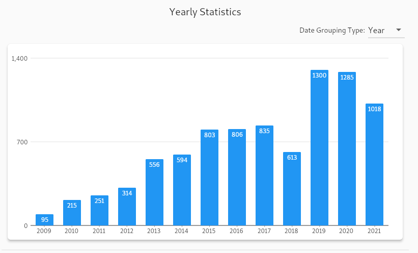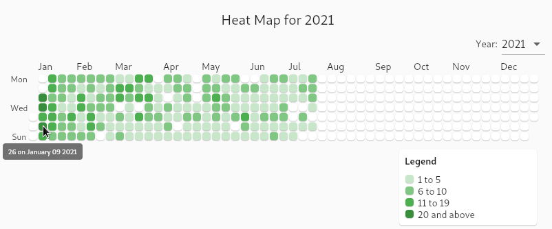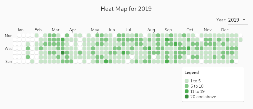 The second component is a “heat map graph” which divides the year into 365 (366 in leap year) tiles laid out vertically by day of the week and horizontally by month. I don’t know if GitHub invented the concept but they certainly popularized it. It is a way to quickly see when you are most active over time. The color of each block is determined by how many of whatever item you are looking at statistics on you have. The darker the color the more active you are. If you hover over one of the tiles it will show the number of items on that date. I posted two of my heat maps below, one for 2019 and one for 2021: