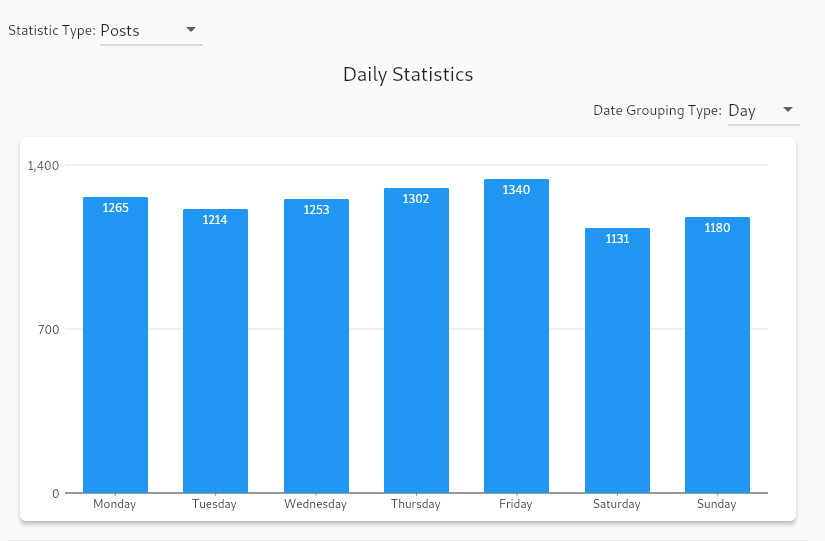 By far one of my favorite things is to quantify things in my life. It’s an engineer thing. I really wanted to do something like that with my Facebook data long before I got onto the whole “Delete Facebook” thing. The new Stats Screen will let you do just that. The stat screen has three components. The first component is a bar graph which displays the count of all of your posts by either the day of the week, the month of the year, or the year. This lets you see longer trends like how your posts per year have changed over time or if you more often posted on the weekends, for example. For example below is the graph of all of my Facebook posts per year and by day. As you can see I was pretty consistent with the days of the week I posted, but slightly less on the weekends. You can also see how exponential my posting frequency got every year, until I decided to try to start getting off Facebook in 2018. I still look forward to seeing my 2022 stats which will hopefully be nearly zero (just enough to post Kyanite and alternate social network posts).