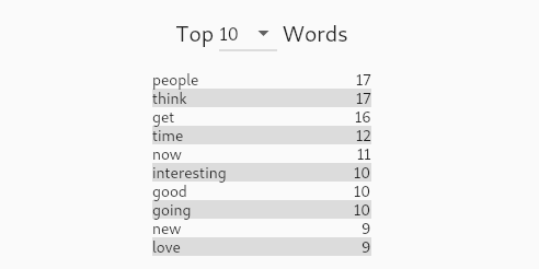 The third component is a “top words” table. This filters out common useless words (like “a”, “the”, “I”, “you”, etc) and then tabulates over all of the text what the top words are. It defaults to the top ten but it’s possible for the user to select up to the top 100 posts. For example below are the top words in my posts for all of 2011: