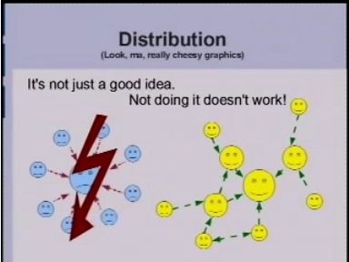 Watching the Google engineers try to grok how Git worked and made sense probably seems odd to present day viewers who didn’t live through the era. But imagine explaining to a mid-1980s person a smartphone when they had barely seen computers used for daily tasks and the idea of a global high speed network connecting all devices was more fantastical sounding than what they saw on Star Trek: The Next Generation. It was so radically different that it was hard not to see more pitfalls than salvations, especially since what we were doing was working well enough 80% of the time. Part of the problem was the way the decentralization was presented. Here is Linus’s slide showing the “bad way” of traditional server based SCM to the “good way” distributed SCM of Git: