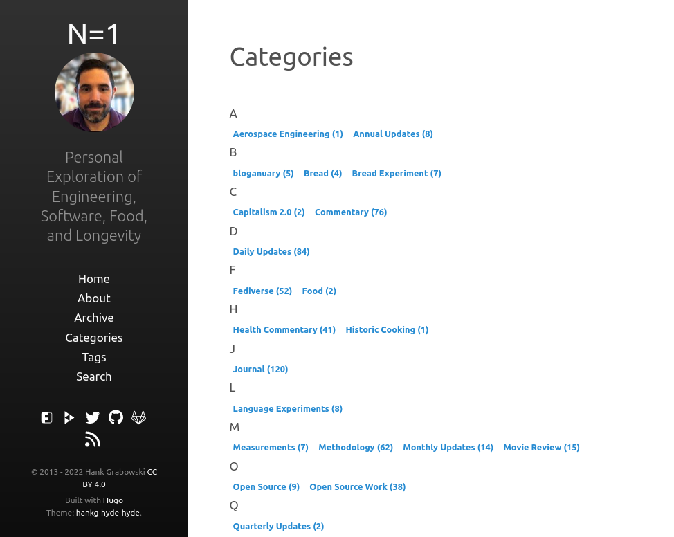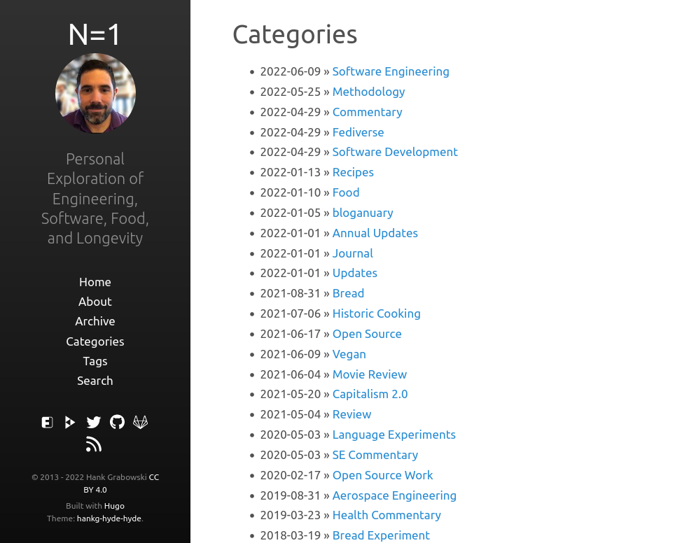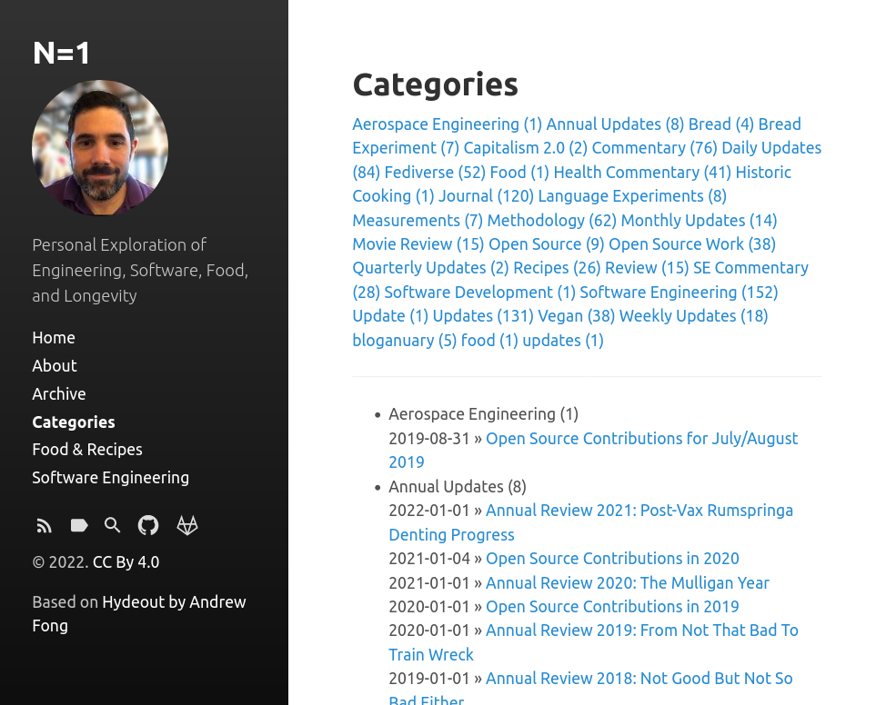 However it was recently pointed out to me by a friend that it was hard to navigate the page the way it was originally designed. It was ordered by type. So “Software Engineering” had all my commentary pieces, then fediverse-specific posts etc. My last Software Engineering commentary though was from 2020 so it looks like the list of articles for the whole page started in 2020. Scrolling down would finally show other sections but nothing was indicative that .at the top that there were multiple sections. A reader therefore may not know about that if they hadn’t bothered to scroll long enough. I would therefore need to fix some of the UX. However with the far better presentation style of the categories and tags in this version of the site I think those sections may be superfluous. Showing that I have both types of content at the top level could be helpful so perhaps they’ll come back in some form but not for the time being.