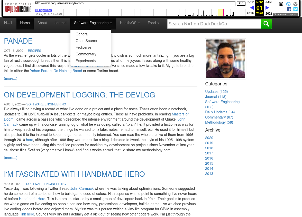 Lastly, in my original page I had some special sections that aggregated my food/recipes and software engineering topics into one page. This emulated my pre-streamlined site’s menu system. That was when it looked something like this (thank you WayBack machine for letting me reproduce it since I am, ironically, having Gem conflict problems preventing me from building that version of the site myself).