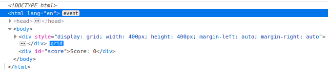 We essentially have three widgets that we are returned from our build method: the WindowKeyboardListener to globally listen for key events, the GameBoardWidget class that visually represents our game board, and a DomComponent where we will store our score text. Jaspr uses Dart Streams for its return system since that is a more organic way of handling objects with respect to the DOM than the Flutter Widget paradigm but the premise is essentially the same. As this is the root of the application all of these will be added to the body of the DOM at the top level with children DOM objects being created underneath. We can see this in the Firefox Inspector for this page: