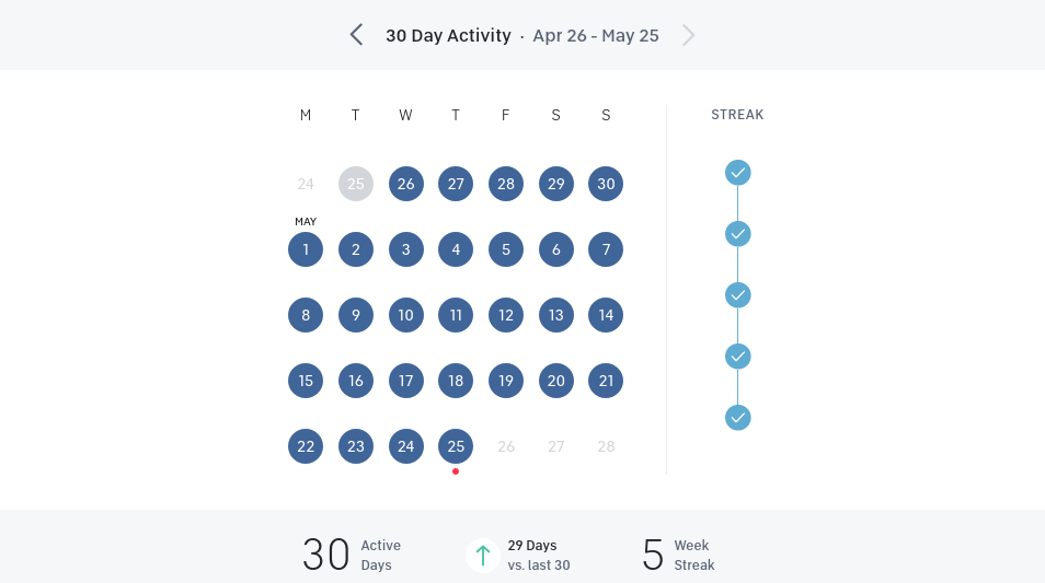 As I wrote at the beginning of this challenge, “By far the thing I have the biggest problem dialing in consistently is exercise.” While this was about doing an across the board tune up those were my focus items. On that score I was able to ace the challenge. I literally did not miss a single day of cardio or training. Across the years I tracked this I have never maintained such a long run. I am therefore beyond pleased with that result. Along with actually hitting the targets my capabilities in each of those categories. The training runs on the Peloton bike started off with me dogging it even on the easy “beginner” ones. Now I can do those same ones as my “easy day” rides within the prescribed rotation rate and resistance ranges. The HIIT training and more intense exercises are also becoming more approachable too. I’m actually mostly in the bottom end of the range on these hard rides. I will consider myself successful when I can be in the range the entire ride. I have a long way to go but am impressed with how much progress I made in just the thirty days. Which makes me tickled pink when I look at this chart from the Peloton site where I track all the workouts: