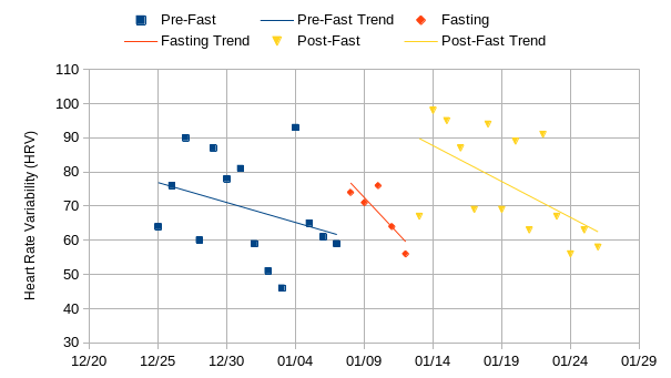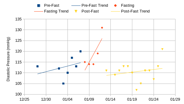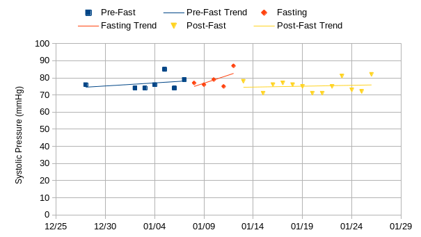 Resting Heart Rate (RHR) fluctuated from 51 bpm in the period before the fast, down to 48 bpm during the fast, and up to 53 bpm for the period after the fast. These variations are well within the natural variations I have over the past several months after getting my fitness dialed in. The Heart Rate Variability (HRV) values have similiarly small fluctuations with 69 ms before the fast, 68 ms during the fast, and 76 ms after the fast. Again these are within the normal fluctuations I usually see. During illnesses or overtraining the variations in these two parameters can be more exaggerated than this. Therefore the fact that these are within the normal variations range for me indicates that I didn’t overtax myself with the execution of this fast. The same is true of the blood pressure data: