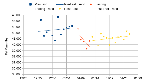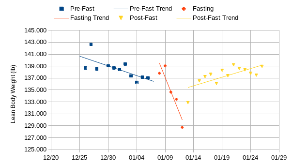 The total net calories for the fast plus post-fast period was -5109 which if all fat would have corresponded with a fat loss of -1.46 pounds of fat. Looking at the body composition and fat/lean mass values we can see that it tracks pretty well with that.