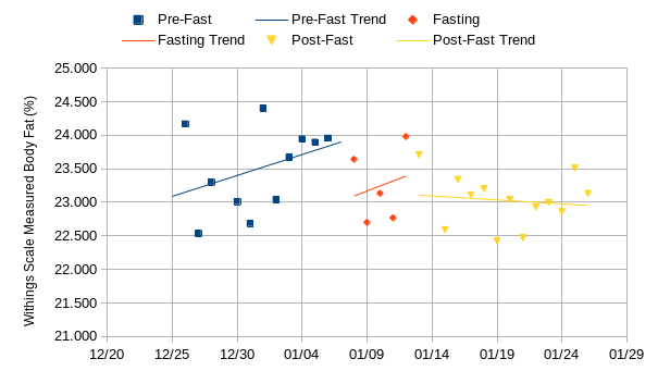 The first big limitation is that the body composition is measured using the Withings Scale which uses a bioelectrical impedance analysis (BIA) method to measure body composition. This measurement type is very noisy. It can be heavily affected by levels of hydration, time of day it is taken, changes in skin surface conductivity (just out of the shower, just out of bed, etc). I also find it very sensitive to the volume of food in the digestive system, although not as much in recent years as with earlier versions of their algorithm. That obviously is going to have a huge impact during the fast. For me it was always 5-6 percentage points low in past years. Last summer I switched algorithms which made it closer but now 2-3 points high. Either way I find it useful for longer term trends but useless for absolute level estimation and in short term analysis. Literally from one day to another under normal circumstances it can change by two percentage points. Under fasting conditions the changes will be more dramatic.