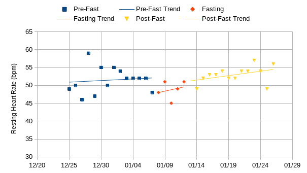 At the beginning of the month I did a week long “water” fast meant to potentially reduce my life-long cancer risk. The methodology I was trying for was described in this kick-off post . With now two weeks of data for the period afterward I can fully document how successfully the fast went and what the effects were on my immediately measurable and tracked biomarkers. What is impossible to do is determine if this is actually doing anything to reduce my cancer risk. That’s something that will at best be determined over time. It’s anti-climactic I know. The “results” question for me in the immediate term is if I’ve crafted a fasting protocol that works for me with minimal side effects.