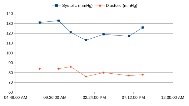 While the day starts off a bit on the high side it drops down into my normal range and stays there for the entire day. These slightly higher levels are witihn the range of where I was about a year ago before my fitness regiment and were also from before the cuff size was adjusted so may be anomalous.