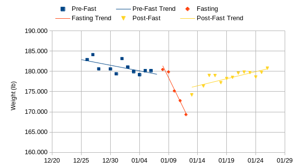 Overall this new 2.0 version of the fasting protocol worked much better for me. I would have liked to have avoided even the ~0.5 pounds of muscle loss but that is kind of in the noise of my natural fluctuations anyway. Assuming I continue to have my workouts dialed by the time I do this fast again in another 6-12 months I may need to increase the amount of weight training I need to do each day. Other than that I think everything is pretty dialed in. The only other potential change I may add is to take blood glucose measurements at least once a day through the fast to see how that fluctuates over time.