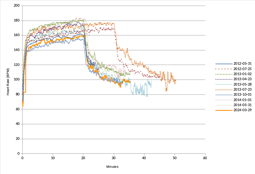 For years I’ve wondered if I could ever get to those cardiovascular fitness highs again. With this very different training style than what I applied before I was thinking I may be sacrificyng shorter term “faster” cardio performance levels for better base building. Having now performed the test again I think I actually am getting both at the same time. In fact I think I am almost at the same performance I was at in my best trained times.