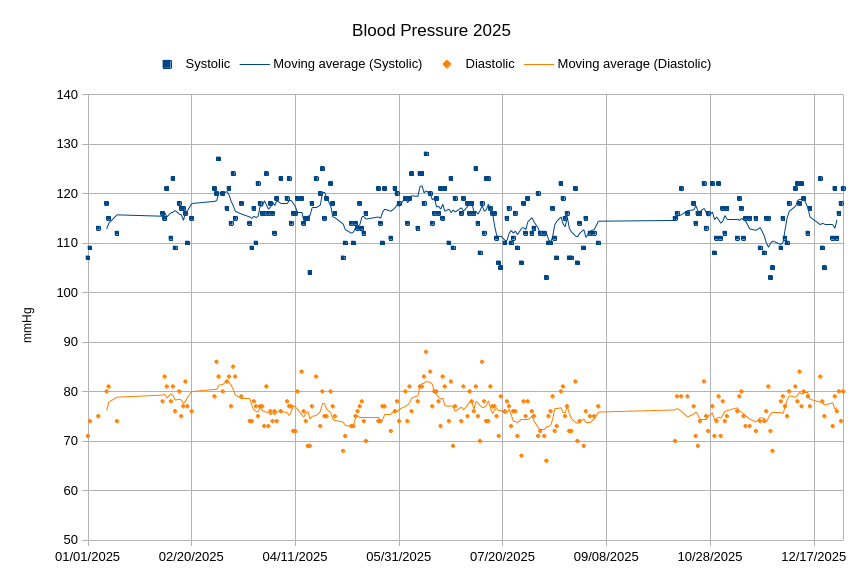 Blood pressure also looked good throughout the year. There are definitely variability throughout. A few weeks the diastolic pressure 7 day moving average crept up a bit over 80 in March and again in June. It quickly returned to my target of 120/80 or lower and an average of 115/77 for the year. I’d prefer that the averages never broke 120/80 and I’d prefer if the averages were more like 110-115/70-75. However these numbers look okay. I want to study them more but this last year has further driven my opinion that once my weight/composition is in the proper range, which it has been for a couple years now, a big driver of keeping my blood pressure in the “good range” is a proper potassium/sodium ratio balance. It’d be great if I was one of those people not sensitive to sodium levels going too high for my body but I’m not one of them. I am glad that even when things have been off the rails my blood pressure still didn’t go to the point of needing pharmaceutical interventions yet. I’m hoping to keep it that way if at all possible.