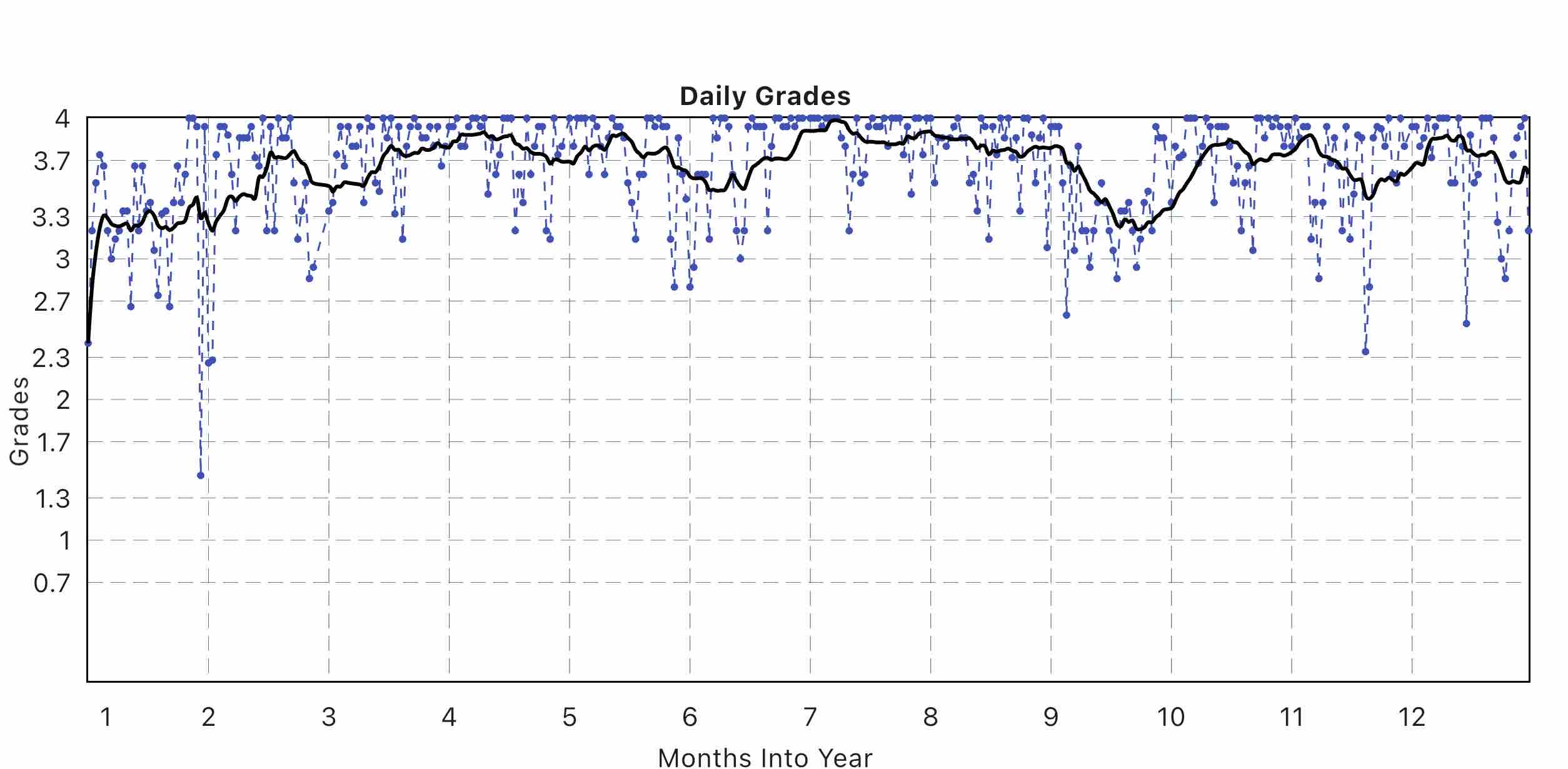 There are a few dinged days where all the scores were low. You can still see the lower averages from the longer trips. However essentially the worst case stead state is still well above a 3.3 GPA. When we look at it compared to other years this turned out to be still one of the strongest years I’ve put in the books since I started tracking back in 2017:
