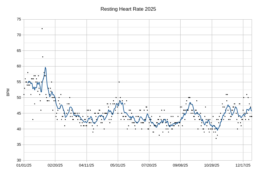 I switched smart watches from Apple Watch to Garmin in the first week of February. Metrics like Resting Heart Rate (RHR) and Heart Rate Variability (HRV) can come out differently between different watch systems. For example, Apple Watch measures heart rate variability throughout the day. Garmin only measures it while sleeping. Usually its the trend that is more important than the absolute value. So for this data set, the first month is with Apple Watch and the rest is with Garmin. Trends before/after have a bit of that caveat at play.