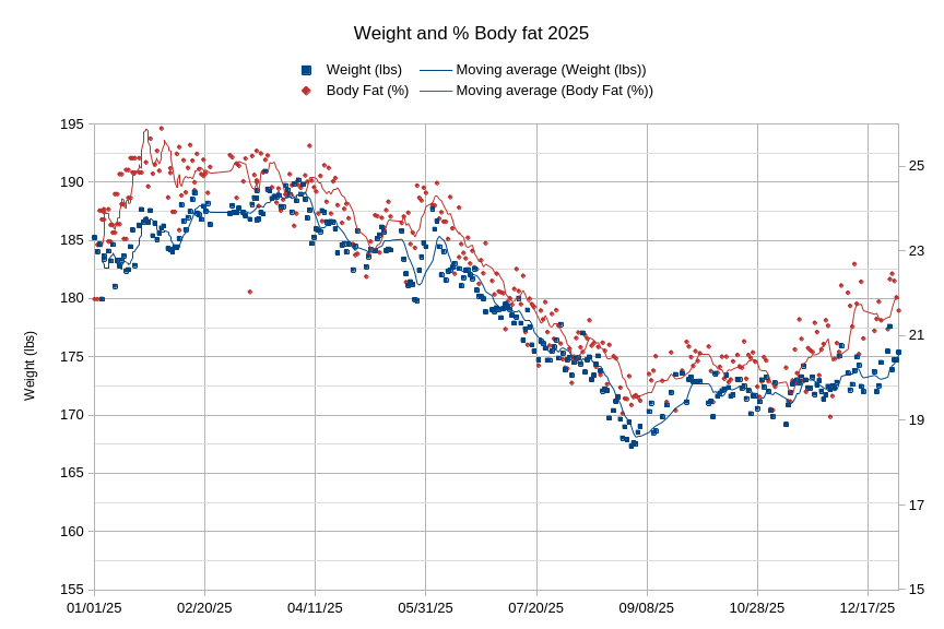 Coming out of 2024 I had had some rebound in my percent body fat and weight. It was nowhere near as high as it was at the start of 2023 but it wasn’t at the levels I was looking for. I’m shooting for a body composition hovering around 20% body fat, give or take a couple points in either direction. Weight I don’t necessarily care about but with my current training regime the two do mostly change in tandem. So starting the year I was just slightly over the target levels. Over that trip in the beginning of the year they jumped up a couple points and remained there until I started trying to drive them down in the second quarter.