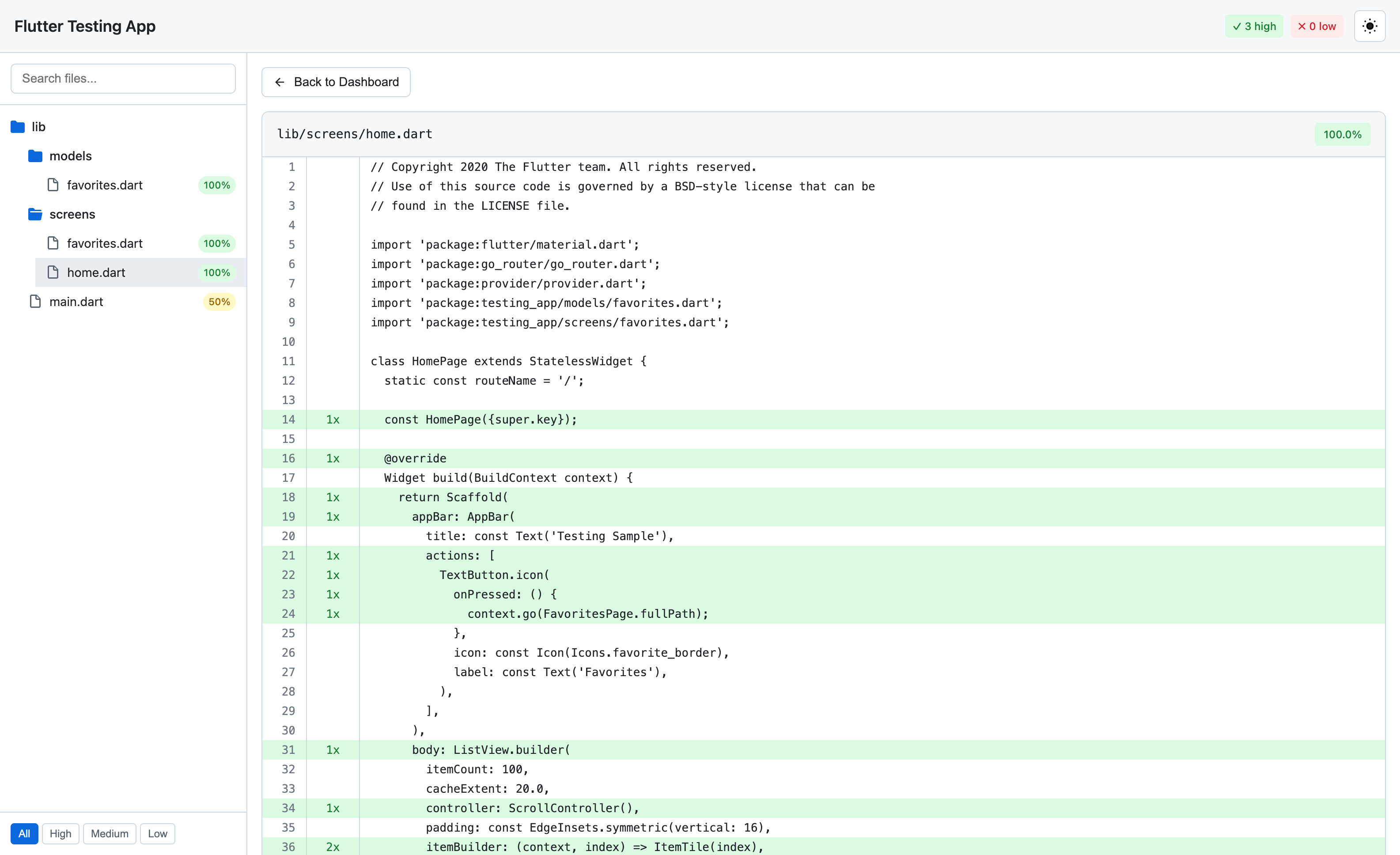 But with a little post processing you can get some decent looking human consumable results. One good tool for this is the Flutter Coverage Report (FCR) tool. It works for both Flutter and Dart projects. It is written in Dart so it runs on every system that is supported for Dart/Flutter development. You install it in the same way we did the Dart Coverage tool: