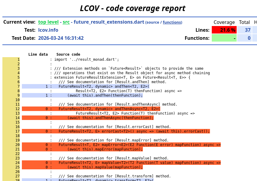 I like having some estimate of how good my unit tests are covering my code. That is especially true for libraries I publish for others to use. I’m making some updates and upgrades to my Dart Result Monad library . I had to dust off my knowledge of doing code coverage in Dart since it had been awhile. It is relatively straightforward to generate these statistics for your Dart and Flutter projects using a couple of tools found in the pub.dev ecosystem. However it took me a couple of trial and error iterations to get the cobwebs out. So I decided to document it here.