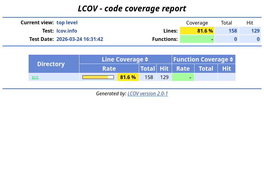 Another system for generating a similar report is to use LCOV itself. It has a tool named genhtml that does a similar thing as the above FCR tool, albeit with a more archaic looking HTML format but with some additional features. LCOV is available on all Linux systems, macOS through Homebrew